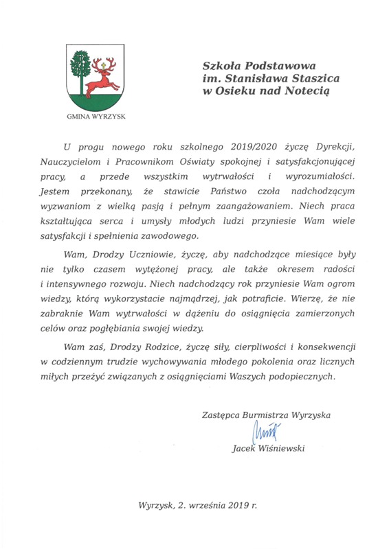 Nie zabrakło również ciepłych słów od p. Jacka Wiśniewskiego – Zastępcy Burmistrza Wyrzyska, w liście skierowanym do dyrekcji, nauczycieli, pracowników, rodziców a także uczniów.