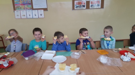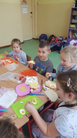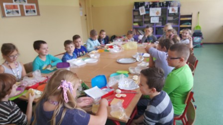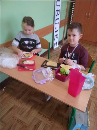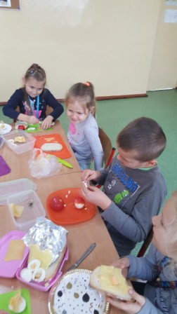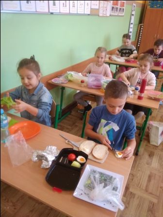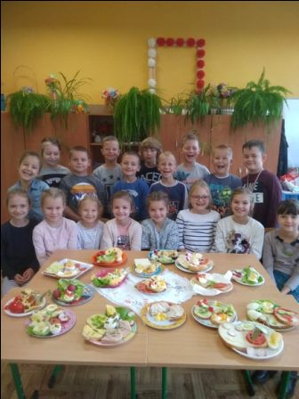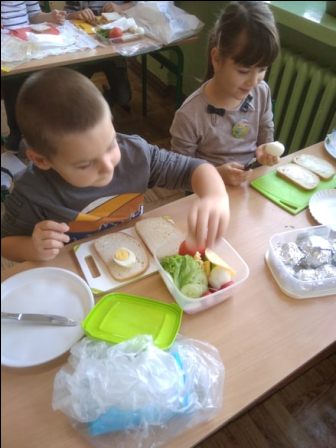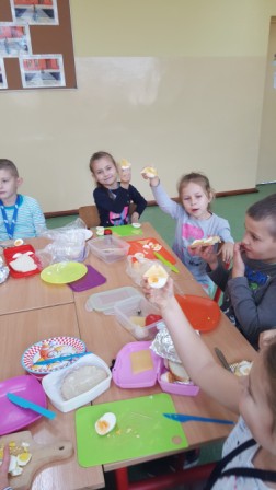 W środę 9 października uczniowie klas pierwszych przygotowali kolorowe Przysmaki z jaj. Zajęcia miały na celu zachęcenie do spożywania zdrowych posiłków. Na stolikach pojawiły się łódki, grzybki oraz pomysłowe kanapki, których głównym składnikiem były jajka. Dzieci dowiedziały się, że zawierają one wiele składników odżywczych i witamin ważnych dla naszego zdrowia. Są przede wszystkim źródłem pełnowartościowego białka łatwo przyswajalnego przez organizm. Uczniowie chętnie pracowali, zachowując ład i porządek w miejscu pracy. Szczególną uwagę zwracali na bezpieczeństwo w posługiwaniu się nożem. Na koniec odbyła się degustacja przygotowanych przez siebie jajecznych przysmaków.