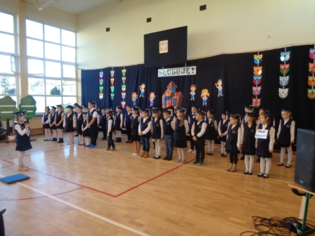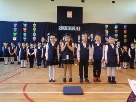 Zanim nastąpiła podniosła chwila pasowania, uczniowie odświętnie ubrani w stroje galowe i birety, zaprezentowali swoje umiejętności. Udowodnili, że potrafią śpiewać, recytować wiersze i wykonywać zadania. Występy dzieci spotkały się z bardzo ciepłym przyjęciem. Mali artyści po każdym występie byli nagradzani gromkimi brawami.