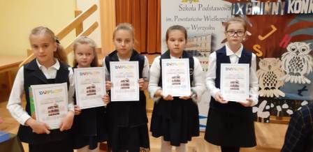 20 listopada w Szkole Podstawowej w Wyrzysku odbył się IX Gminny Konkurs Pięknego Czytania. Celem konkursu było doskonalenie techniki czytania, rozbudzanie wrażliwości na piękno słowa oraz poznawanie nowości z literatury dziecięcej. Ocenie podlegała m.in. technika czytania: interpunkcja, dykcja, płynność i tempo czytania czy środki artystycznego wyrazu. Naszą szkołę reprezentowało 5 uczennic. Emilia Zbieralska z klasy 2 a zajęła drugie miejsce w kategorii klas drugich.