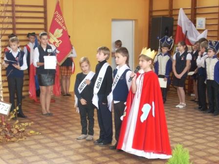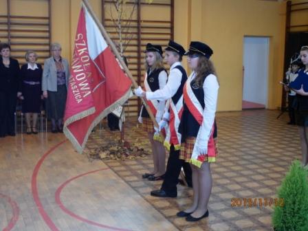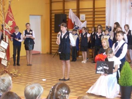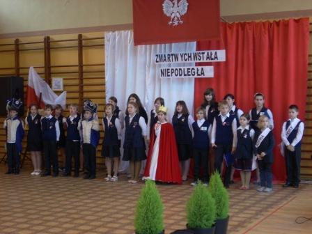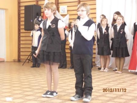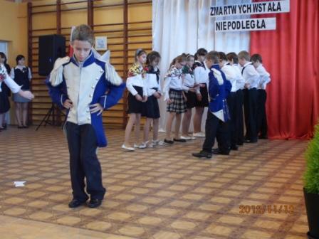 Młodzi artyści w krótki, choć wymowny sposób zaprezentowali widowni, jak przedstawiały się polskie dzieje aż do czasu wyzwolenia spod jarzma zaborców, a więc do sławnego 11 listopada 1918 roku. Uczniowie klas IV b oraz VI b pod opieką pań – Izoldy Perlińskiej oraz Darii Maciejewskiej starali się śpiewem, recytacją, pantomimą oraz tańcem upamiętnić tą istotną dla każdego Polaka datę. Widzowie w ciszy i skupieniu obejrzeli występ i wysłuchali pieśni patriotycznych w wykonaniu chóru pod opieką nauczyciela muzyki – Pana Leszka Kusza. Tancerze przygotowani zostali przez nauczyciela wychowania fizycznego – Pana Sławomira Pinkowskiego.