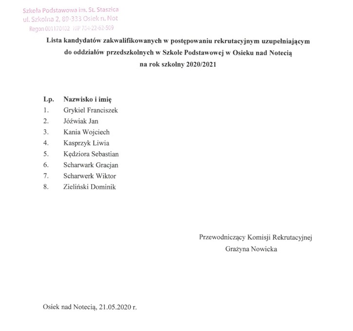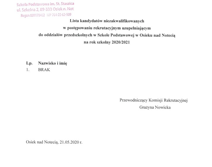Listy kandydatów zakwalifikowanych oraz niezakwalifikowanych w postępowaniu rekrutacyjnym uzupełniającym do oddziałów przedszkolnych na rok szkolny 2020-2021 w Szkole Podstawowej im. Stanisława Staszica w Osieku nad Notecią