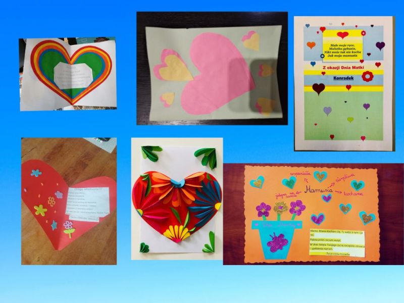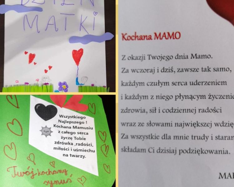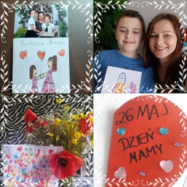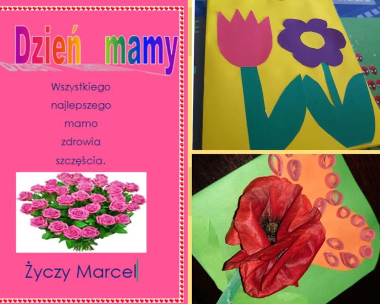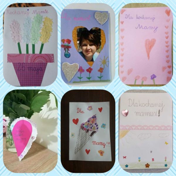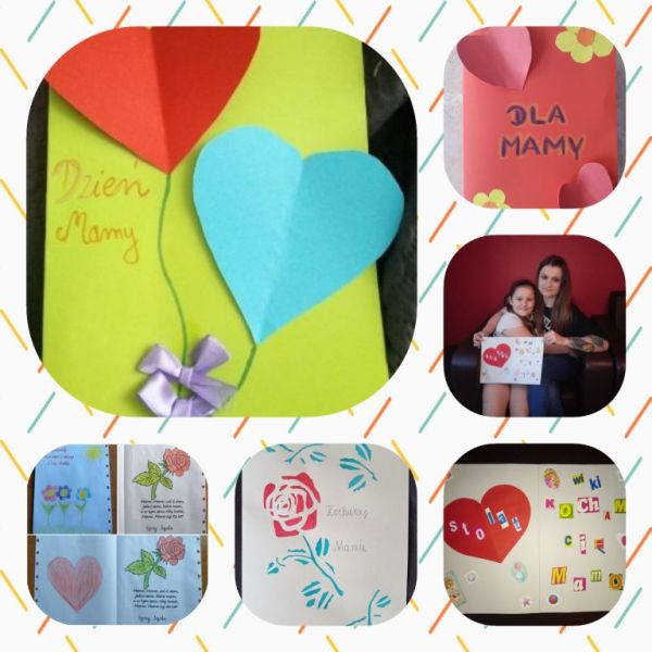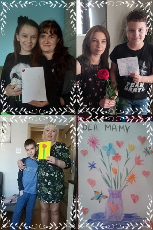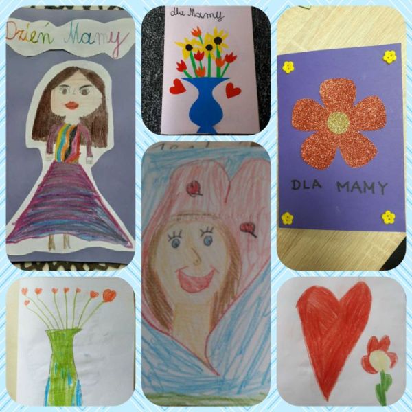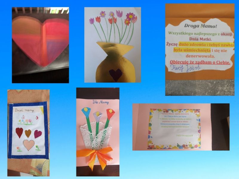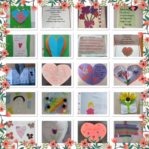 W czasie zdalnych lekcji uczniowie uczestniczyli w rozmowach na temat roli mamy w życiu dziecka oraz redagowali życzenia z okazji ich święta. Na zajęciach plastyczno – technicznych uczniowie wykonywali różnymi technikami piękne wielobarwne laurki. Wychowawczynie poszczególnych klas zebrały nadesłane prace i utworzyły piękne fotokolaże. Oto efekty ich pracy.