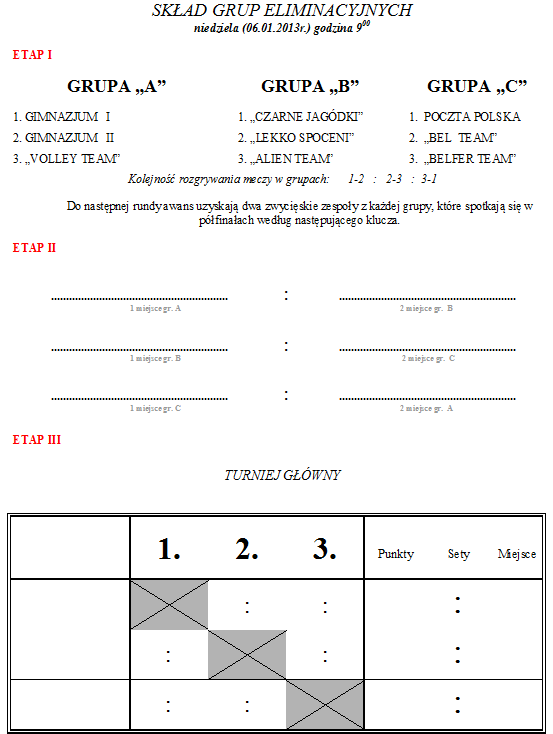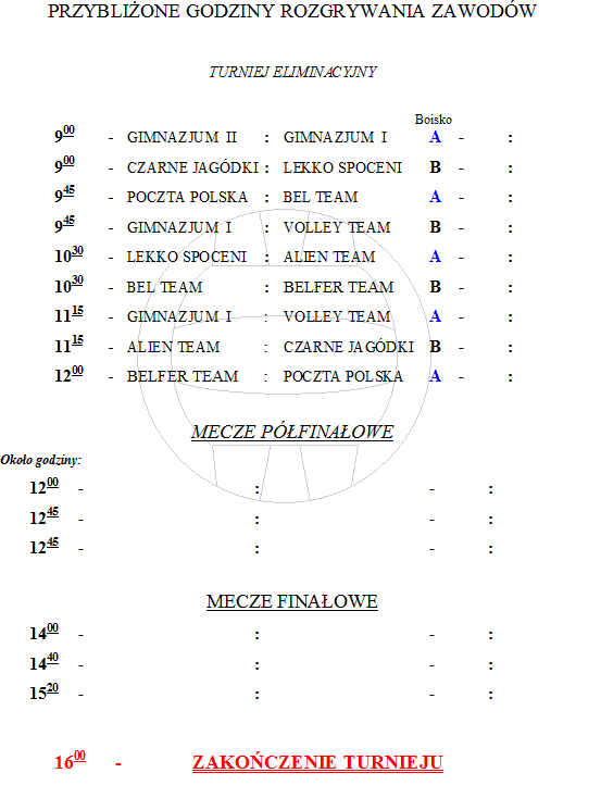 ORGANIZATOR ZASTRZEGA SOBIE PRAWO PRZYSPIESZENIA ROZGRYWANIA POSZCZEGÓLNYCH MECZY W PRZYPADKU WCZEŚNIEJSZEGO ZAKOŃCZENIA ZAPLANOWANYCH SPOTKAŃ.