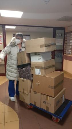Niestety nie mogliśmy osobiście spotkać się i przekazać im podarunków. Zrobiliśmy to za pośrednictwem pielęgniarek pracujących na tym oddziale. Panie zaskoczone tak wielką ofiarnością, z niedowierzaniem zerkały na bagażnik samochodu, z którego wydobywaliśmy - wydawałoby się - niekończącą ilość kartonów, toreb i reklamówek…