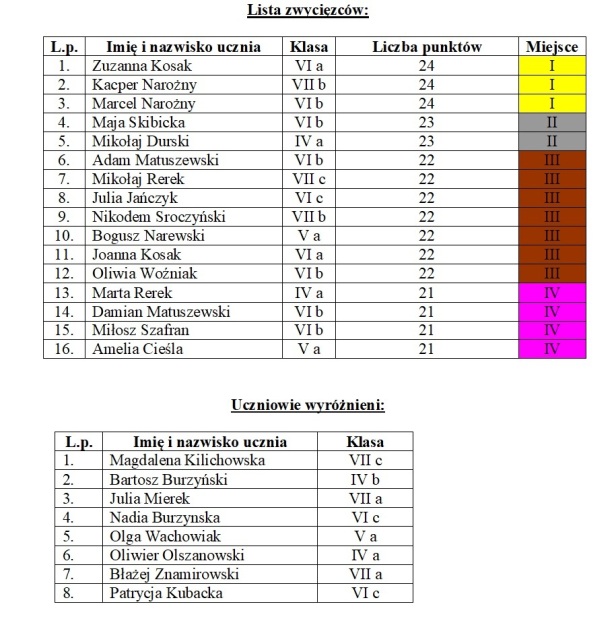 Dziękuję za udział, zaangażowanie i świetną zabawę wszystkim uczestnikom. Zwycięzcom i wyróżnionym serdecznie gratuluję. Wręczenie nagród odbędzie się po powrocie do szkoły.