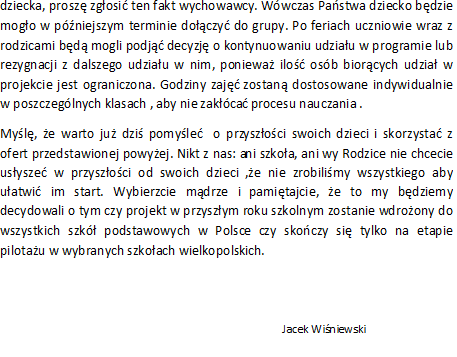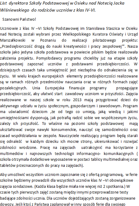 List dyrektora Szkoły Podstawowej w Osieku nad Notecią Jacka Wiśniewskiego do rodziców uczniów z klas IV-VI.