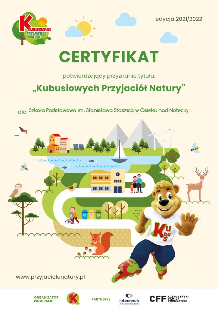 Dzieci z oddziałów przedszkolnych w roku szkolnym 2021/2022 uczestniczyły w programie edukacyjnym “Kubusiowi Przyjaciele Natury”. To jeden z największych ogólnopolskich programów edukacyjnych dla przedszkoli oraz szkół podstawowych poświęcony tematyce ekologicznej, organizowany przez markę Kubuś. Jego celem jest proekologiczna edukacja dzieci i zachęcenie ich do ruchu już od najmłodszych lat. W ramach tego odbywały się zajęcia, dzięki którym dzieci wprowadzane były w piękny i niezwykły świat przyrody. Przedszkolaki dowiedziały się jak chronić otaczające nas środowisko, w jaki sposób szanować rośliny i zwierzęta oraz zachęcane były do aktywnego spędzania czasu, zarówno na świeżym powietrzu, jak i w domu. Po zakończeniu programu oddziały przedszkolne otrzymały certyfikat “Kubusiowych Przyjaciół Natury”.