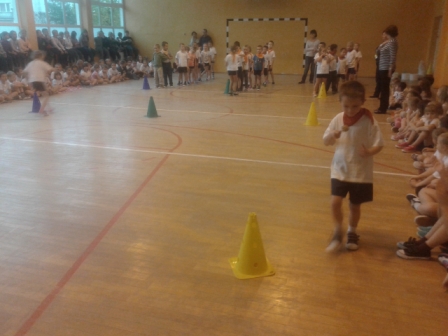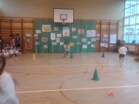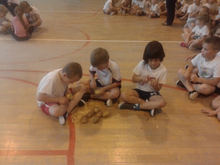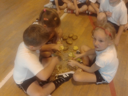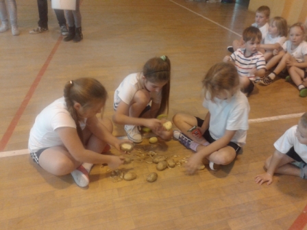 Po poczęstunku ponownie wróciliśmy na salę gimnastyczną, gdzie odbyły się kolejne konkurencje z udziałem ziemniaka. Były to: rzucanie ziemniaków do wiaderka, noszenie ziemniaka na paletce oraz obieranie ziemniaków. W tej ostatniej konkurencji zawodnicy udowodnili, że pomagają mamie w kuchni, a nóż nie jest ich wrogiem. Rywalizacja klasowa była bardzo wyrównana, co nagrodzono gromkimi brawami.