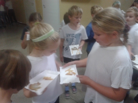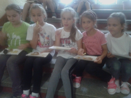 Po tylu emocjonujących zawodach wszystkie dzieci zostały zaproszone na poczęstunek-niespodziankę. Dzięki pomocy pań z kuchni mogły skosztować: placki ziemniaczane, frytki oraz pieczone ziemniaki z ogniska, które przygotował niezawodny nasz pan Stefan.