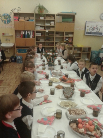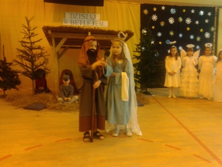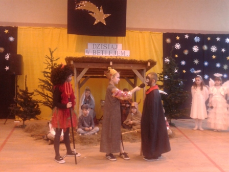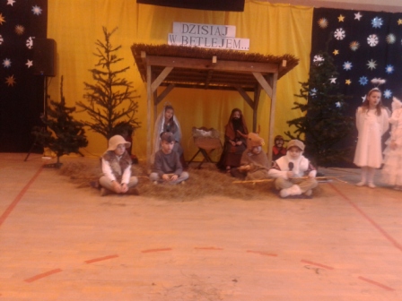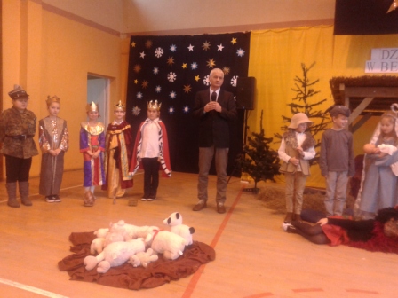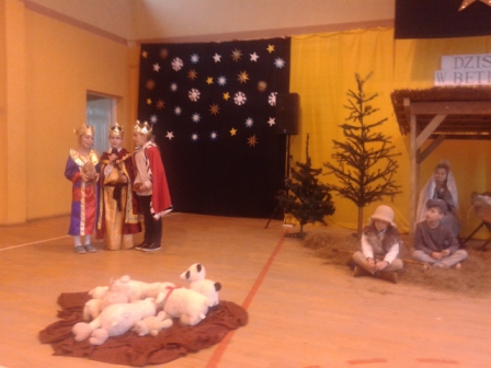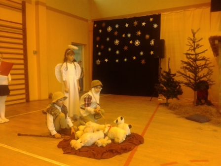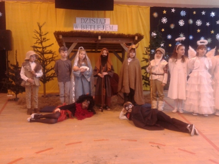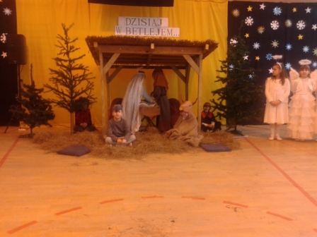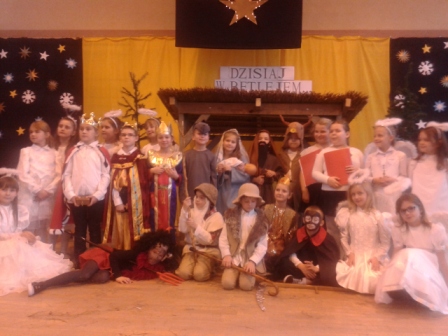 19 grudnia w naszej szkole od rana odbywały się spotkania wigilijne w poszczególnych klasach. Po spotkaniach klasowych wszyscy spotkaliśmy się w sali gimnastycznej, aby obejrzeć przedstawienie mówiące o narodzinach Chrystusa. Jasełkom towarzyszył śpiew kolęd. Szopka, żłobek, choinki, piękne kostiumy to wszystko razem dodało uroku i świątecznego nastroju. Licznie zgromadzeni goście nagrodzili małych artystów gromkimi brawami. Po zakończeniu przedstawienia ku zaskoczeniu uczniów na salę przybył Gwiazdor.