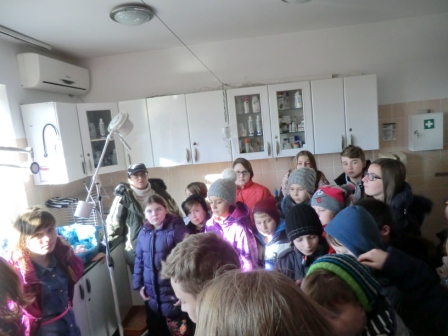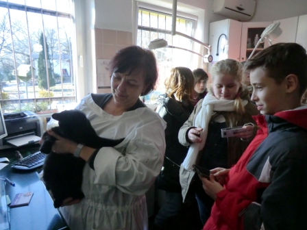 Pierwszy raz mieliśmy ten zaszczyt, że o schronisku, jego pracy, jak i o samych zwierzętach tam mieszkających, opowiadała w ciekawy i zajmujący sposób Pani Dyrektor Izabella Szolginia. Po przekazaniu karmy i innych darów, odbyliśmy krótki spacer po terenie schroniska. Ze strony uczniów padało wiele pytań, na które otrzymywali wyczerpujące odpowiedzi. Sami też zostali „przepytani” przez Panią Dyrektor. Pytania dotyczyły np. obowiązkowych szczepień, jakie zwierzęta muszą posiadać, by uniknęły groźnych chorób. Mogliśmy zobaczyć także, w jakich warunkach mieszkają zwierzaki i jak świetną opiekę otrzymują. Zwiedziliśmy gabinet weterynaryjny, o którego działalności opowiedziała nam Pani lekarz weterynarii Lucyna Kuziel- Zawalich w asyście pięknego, czarnego kota Rademenesa. Oczywiście zdjęciom nie było końca! Na sam koniec niektórzy z uczniów wyznali, że „obdarzyli miłością od pierwszego wejrzenia" pieski i koty, po które obiecują wrócić tu z rodzicami.