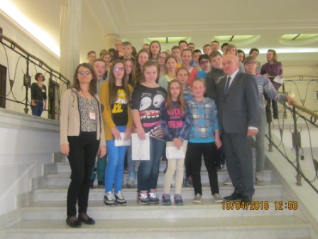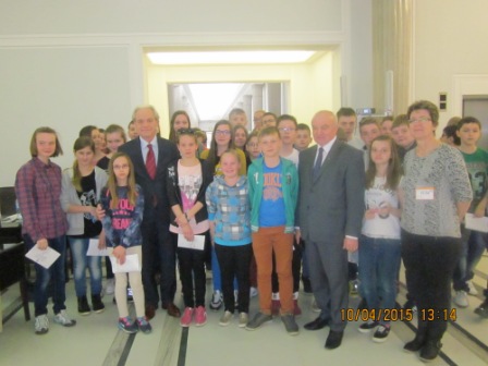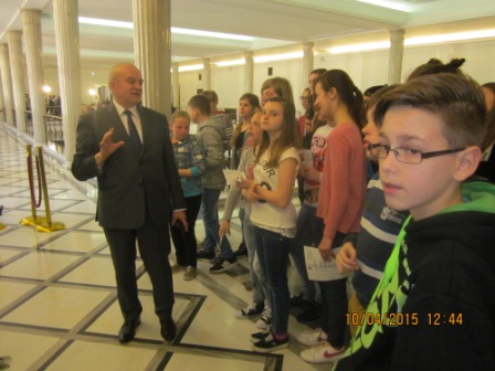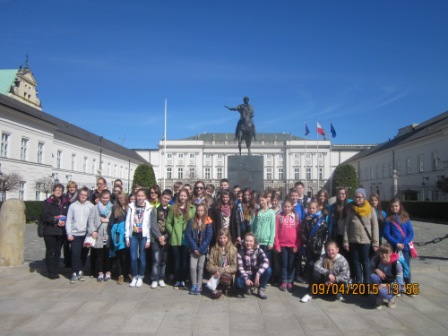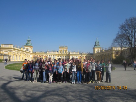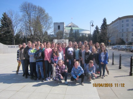 Drugiego dnia gościliśmy w Sejmie na zaproszenie posła Stanisława Kalemby, który osobiście nas oprowadzał. Był to szczególny dzień, bo 10 kwietnia, czyli piąta rocznica tragedii w Smoleńsku i przeddzień kolejnej już 75. rocznicy Katynia – miejsca zamordowania ponad 20 tysięcy polskich oficerów. W Sejmie roiło się od znanych polityków. Wszyscy chcieli sobie robić z nami zdjęcia ;) np. Pani Senator PSL z Wielkopolski – Andżelika Możdżanowska czy Europoseł PO - Adam Szejnfeld, który zapraszał nas do Brukseli. Wczesnym popołudniem odbyliśmy lekcję historii w Pałacu Króla Jana III Sobieskiego w Wilanowie. Jednak dopełnieniem niezwykłych przeżyć tego dnia, było spotkanie Prezydenta RP Bronisława Komorowskiego z żoną, na spacerze w Parku Łazienkowskim. Pan Prezydent okazał się ciepłym człowiekiem. Zainteresował się skąd jesteśmy i ku naszemu zdziwieniu wiedział, gdzie leży Osiek nad Notecią i że jest u nas Skansen Etnograficzno-Archeologiczny. Kilka zdjęć, w tym selfie z Prezydentem, wzbogaciło naszą galerię.