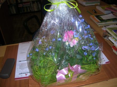 Miłą niespodziankę dla bibliotekarek, jak zawsze, przygotowali uczniowie świetlicy szkolnej pod kierunkiem pani Jolanty Łukowskiej. Obdarowali bibliotekarki pięknymi kwiatami oraz jeszcze ciepłą drożdżówką. Ciastem zostali poczęstowani uczniowie klas VI, którzy na lekcjach plastyki, pod opieką pana Leszka Kusza wykonali dla nas okolicznościowe kartki. Zdobią one korytarz naszej szkoły.