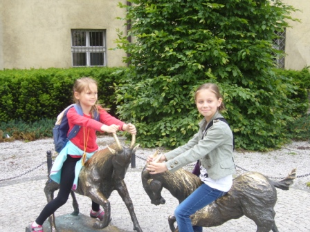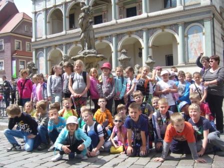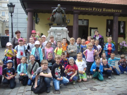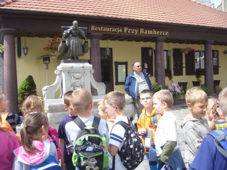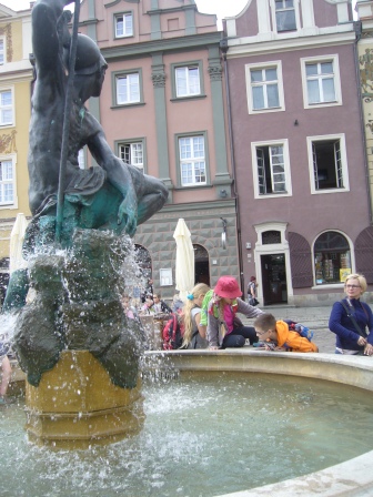 Kolejnym miejscem naszej wycieczki był Stary Rynek. Tam zobaczyliśmy koziołki, zjedliśmy smaczny obiad oraz spotkaliśmy się z naszym przewodnikiem, który oprowadził nas po najciekawszych miejscach. Pierwsze kroki skierowaliśmy do Studzienki Bamberki. Rzeźba ta upamiętnia przybyłych do Poznania osadników z okolic Bambergu, którzy mieli zasiedlić wyludnione wojnami i zarazą należące do miasta wsie. Kolejnym miejscem była figura św. Jana Nepomucena - rzeźba, wyobrażająca utopionego niegdyś w Wełtawie czeskiego kapłana, który był uważany za skutecznego obrońcę od powodzi. Święty miał zapewnić bezpieczeństwo miastu, nękanemu częstymi wylewami Warty. Ciekawą rzeźbą był Pręgierz. Postać kata z uniesionym w górę mieczem, symbolizującym prawo karania śmiercią, w jednej ręce i rózgą w drugiej wieńczy poznański "słup hańby".