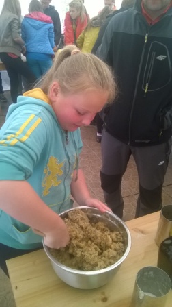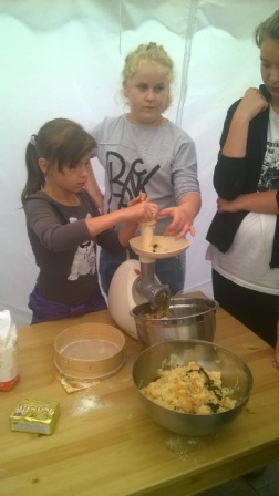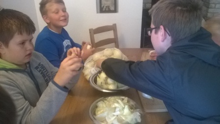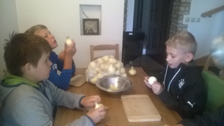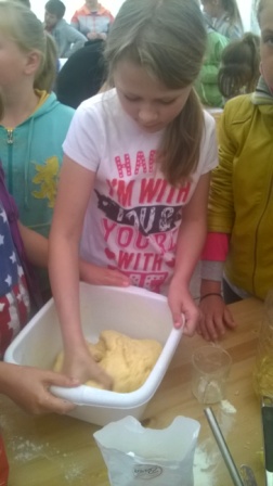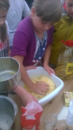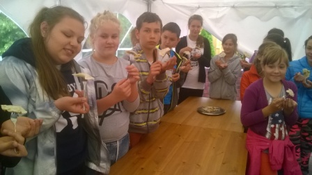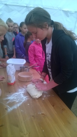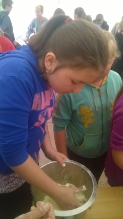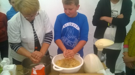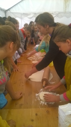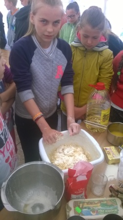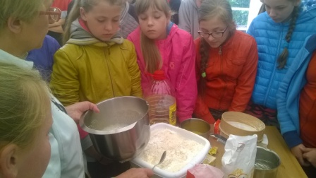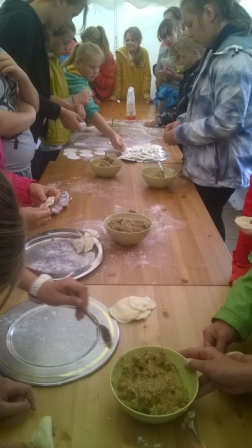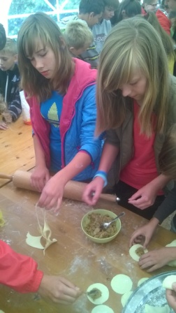Pierwsza połowa dnia przebiegała pod hasłem ,,Kulinarna przygoda w przyrodzie''. Były to warsztaty gastronomiczne u Pani Krystyny Kowanek z Zatomia. Pod opieką sympatycznej Pani Kowanek uczyliśmy się lepić pierogi i zarabiać ciasto drożdżowe. Podczas tych zajęć ujawniły się u niektórych z nas zdolności kulinarne. Po części praktycznej nastąpiła najbardziej przyjemna część, czyli degustacja naszych wytworów.