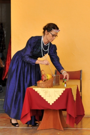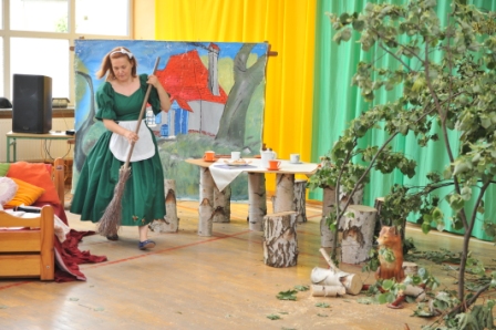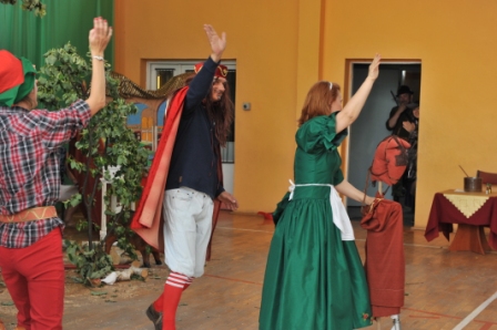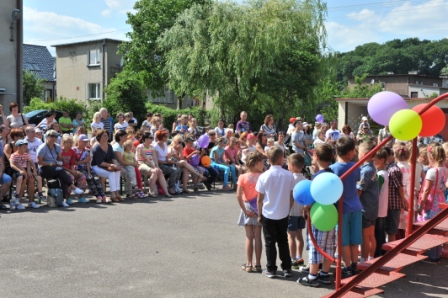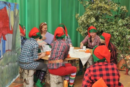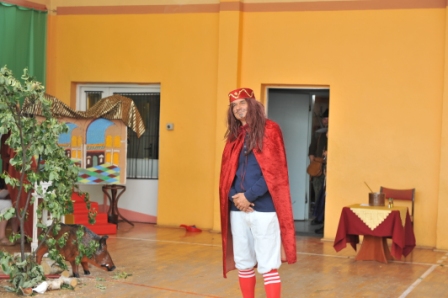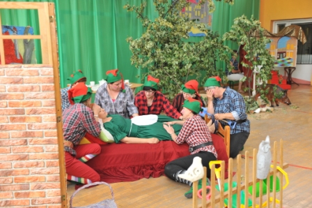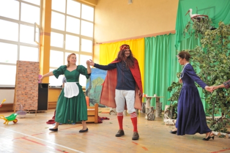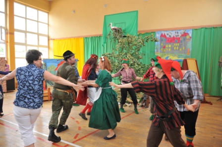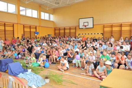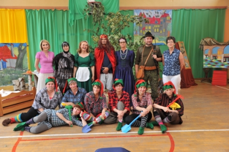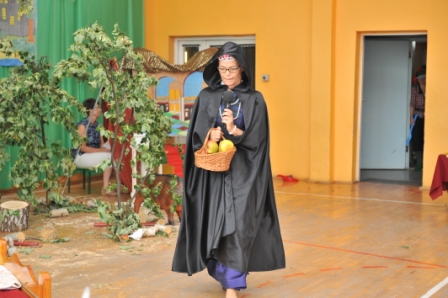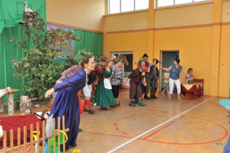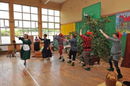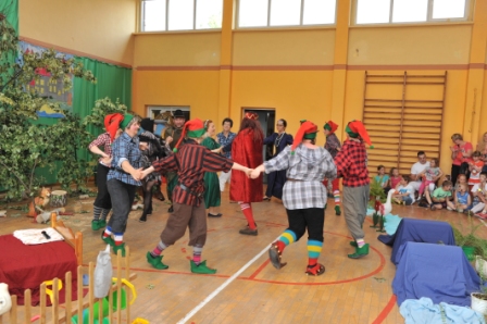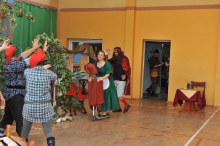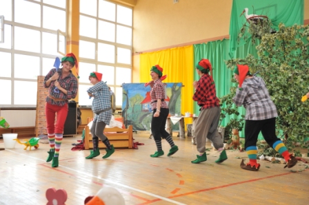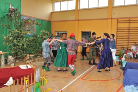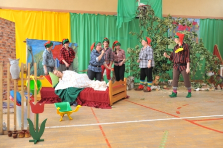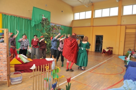 Po tych emocjach impreza na kilka chwil przeniosła się do budynku szkoły. Tu szczery zachwyt wzbudziły dekoracje na sali gimnastycznej. Widzowie przenieśli się do zaczarowanego lasu. W takiej to oto scenerii rozgrywała się baśń: „O królewnie Śnieżce i 7 krasnoludkach”. Wystawiali ją nauczyciele i pracownicy szkoły. Wykonanie wzbudziło aplauz wśród zgromadzonej publiczności.