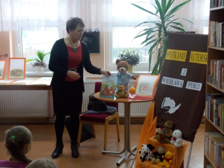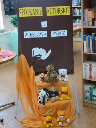 Na spotkanie autorskie z poetką do osieckiej biblioteki publicznej przybyli uczniowie z klasy 1b z miejscowej szkoły podstawowej. Pierwszoklasiści przyszli w towarzystwie swoich ulubionych pluszaków. W nawiązaniu do obchodzonego tego dnia święta, tematem przewodnim spotkania były misie. Autorka podczas spotkania skupiła się na książce „O misiach i o niedźwiadkach”. Przedstawiła także dzieciom przywiezione przez nią pluszaki – bohaterów jej książki. Pani Wiesława opowiedziała, jak książka powstała, zaprezentowała ilustracje w niej zawarte oraz przeczytała swoim małym słuchaczom wybrane fragmenty o misiach. Pierwszoklasiści z zainteresowaniem słuchali przytaczanych tekstów. Treść była dla nich zrozumiała a zarazem humorystyczna i dydaktyczna. Spotkanie miało charakter interakcyjny. Autorka dzięki swemu sympatycznemu usposobieniu nie miała problemu z nawiązaniem z dziećmi kontaktu, toteż prowadziła z nimi interesujący i pouczający dialog. Uczniowie umiejętnie odgadywali zawarte w książce rymy i wyjaśniali różne zachowania misiów i niedźwiadków. Dzieci dowiedziały się też, co to jest gawra i miały okazję zaprezentować niedźwiadkowe przeciąganie się przed legowiskiem. Spotkaniu towarzyszyła wystawka ilustracji zawartych w książkach Wiesławy Pyrcz. Autorka podzieliła się z dziećmi pewną ciekawostką. Ilustratorkami książek są jej uczennice z okresu pracy w szkole.