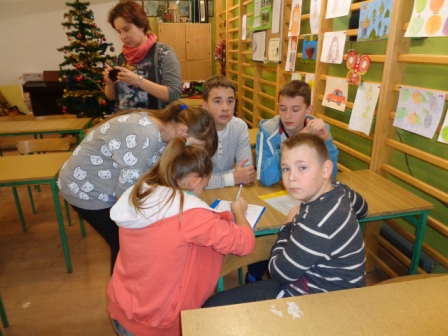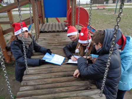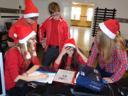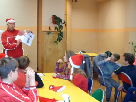 Zabawy mikołajkowe i koncert kolęd, to nie jedyne imprezy tego dnia w naszej szkole. Otóż z samego rana odbyła się gra terenowa, do udziału w której zgłosiły się 4 szkoły z gminy Wyrzysk: szkoły podstawowe w Falmierowie i w Wyrzysku, gimnazjum w Wyrzysku i w Osieku oraz organizator gry, czyli szkoła podstawowa w Osieku. Reprezentacja każdej ze szkół składała się z 5 uczniów – graczy i opiekuna – nauczyciela. Gra obejmowała stanowiska – punkty, znajdujące się na terenie szkoły i w najbliższej jej okolicy, w których należało: potwierdzić swoją obecność, wykonać określone zadania i zdobyć za nie punkty.