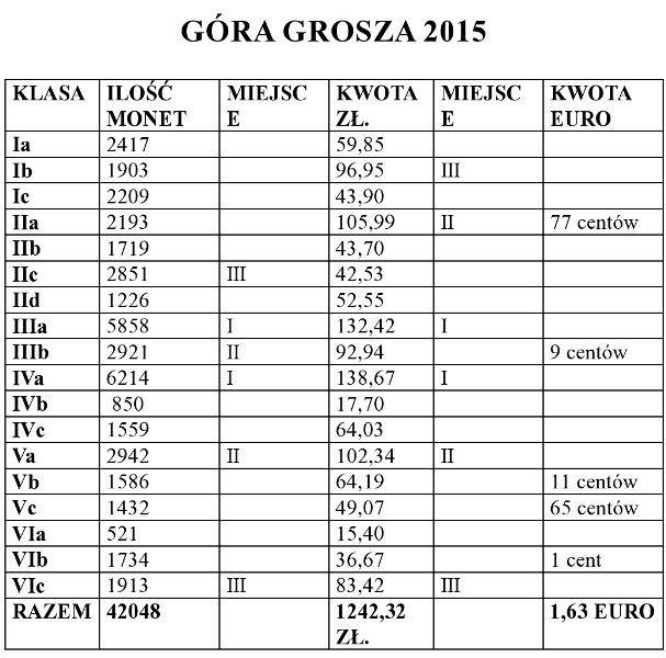 W tym roku podczas akcji Góra Grosza uczniowie naszej szkoły i ich rodzice kolejny raz aktywnie włączyli się w akcję. Celem Góry Grosza jest zebranie funduszy na pomoc dzieciom wychowującym się poza własną rodziną, w tym na tworzenie takich programów, które pozwolą dzieciom wrócić do domu bądź tworzenia takich miejsc, które będą w miarę swoich możliwości zbliżone do domu rodzinnego oraz programów, które pozwolą im spokojnie dorastać.