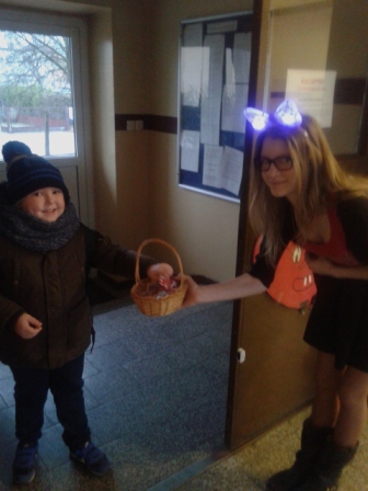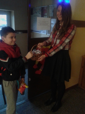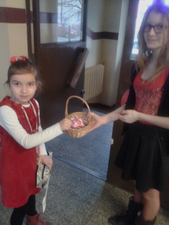 Wchodzących do szkoły witały walentynkowe dziewczyny z koszykiem lizaków w kształcie serca.