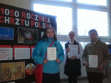 Naszą szkołę reprezentowali zwycięzcy szkolnego konkursu Pola Klinowska, Michalina Sobolewska, Jakub Rosenau. Konkurs składał się z 5 części, w których zadania dotyczyły zarówno historii Polski jak i religii. Po podliczeniu punktacji z każdej części okazało się ,że Pola Klinowska została laureatką konkursu. Poli, jak również Michasi i Jakubowi serdecznie gratulujemy i życzymy dalszych sukcesów w zdobywaniu i poszerzaniu swojej wiedzy.