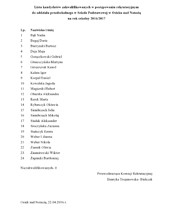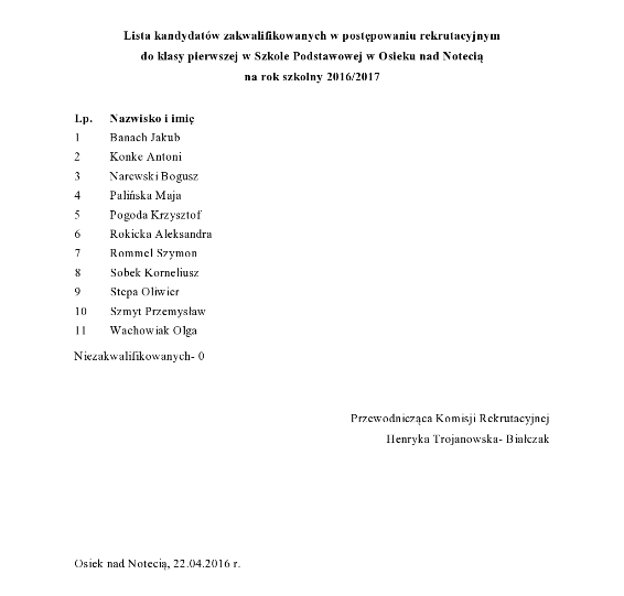 Informacja dla rodziców kandydatów zakwalifikowanych do przedszkola oraz klasy pierwszej