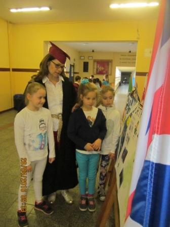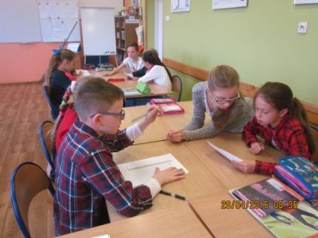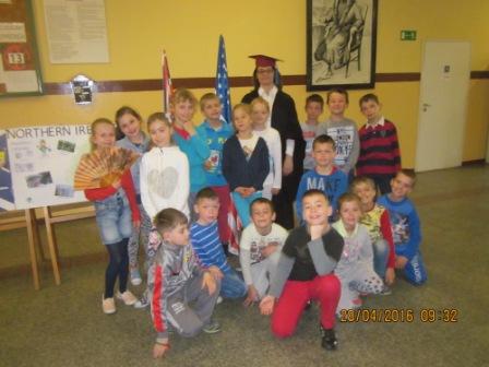 W czwartek 28.04.2016 w Naszej szkole odbył się Dzień Języka Angielskiego. Dla podkreślenia atmosfery tego dnia, uczniowie przyszli w strojach w kolorze flagi brytyjskiej, czyli biały, czerwony oraz niebieski. Poza tym, ze szkolnego radiowęzła dobiegały dźwięki piosenek tylko w języku angielskim. Na wewnętrznych drzwiach budynku naszej szkoły zmieniliśmy oznaczenia z j. polskiego na angielski. Tabliczki wykonali uczniowie klas IV-VI, co wzbudziło zainteresowanie uczniów jak i rodziców. Efektem wcześniejszej pracy uczniów klas IV-VI, była wystawa ich samodzielnie wykonanych plakatów przedstawiających poszczególne kraje wchodzące w skład Zjednoczonego Królestwa Wielkiej Brytanii oraz Irlandii Północnej. Cieszyła się ona dużym zainteresowaniem starszych, jak i młodszych uczniów. Ponadto, na lekcjach języka angielskiego, wszyscy uczniowie rozwiązywali wcześniej przygotowane zadania sprawdzające wiedzę z języka angielskiego. Zadania składały się z krzyżówek, rebusów oraz łączenia obrazków z wyrazami. Wykonywanie zadań sprawiło wszystkim wielką frajdę. Praca w zespołach natomiast, podniosła atmosferę rywalizacji. Zwieńczeniem Dnia J. Angielskiego dla uczniów klas młodszych był film animowany pt. „Despicable Me”, czyli „Jak ukraść księżyc?”, wyświetlony w szkolnej bibliotece. Kameralne grono 11 osób z zaciekawieniem obejrzało przygody bohaterów filmu, czyli Minionków. Warto dodać, że widzowie skorzystali z poduch i dywanu, jakie od n niedawna posiada szkolna biblioteka.