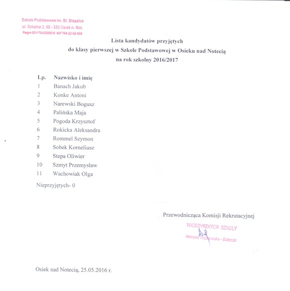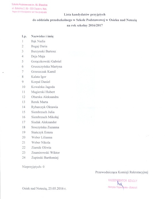 Listę kandydatów przyjętych do oddziału przedszkolnego oraz do klasy 1
