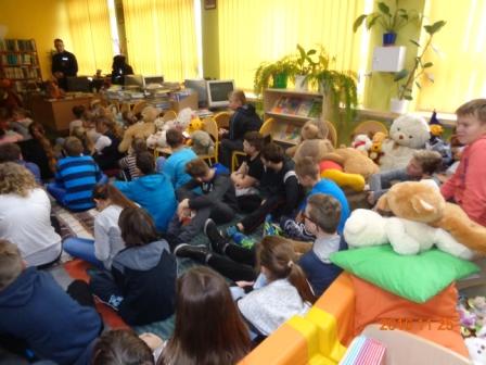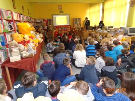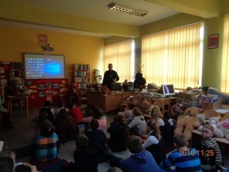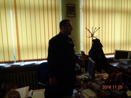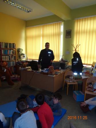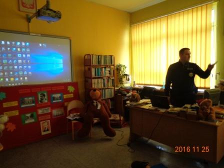 Policjant przypomniał dzieciom o konieczności systematycznego uczęszczania do szkoły, oraz wskazane miejsca niebezpieczne dla uczniów. Parę słów poświęcił też używkom, wspomniał o niebezpieczeństwach wynikających z ich stosowania.