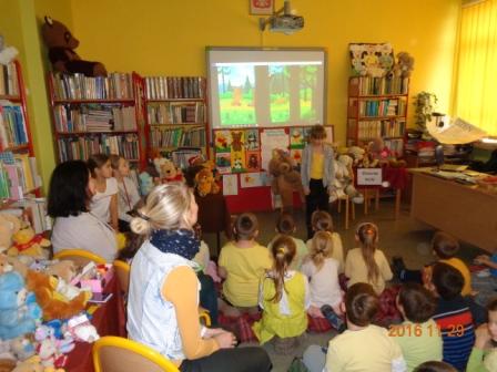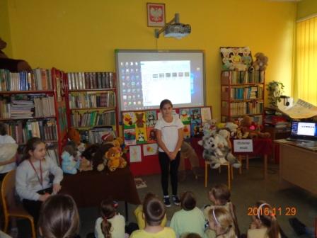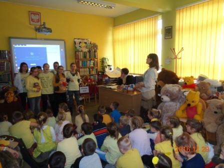We wtorek każdy odwiedzający bibliotekę miał na sobie żółty element, a za dostarczenie misia został poczęstowany drobną słodkością. Na trzeciej i czwartej godzinie lekcyjnej gościliśmy klasy I- III wraz z wychowawczyniami. Na uczniów czekały różne atrakcje. Najpierw została wyświetlona prezentacja multimedialna, która przedstawiała historię pluszowego misia oraz filmowych bohaterów. Następnie zaprezentowali się uczniowie z klas I-VI, którzy recytowali wiersz lub śpiewali piosenkę o misiu. Wszyscy bardzo ładnie się przygotowali. Jednak najwięcej oklasków zdobył zespół z klasy Vc.