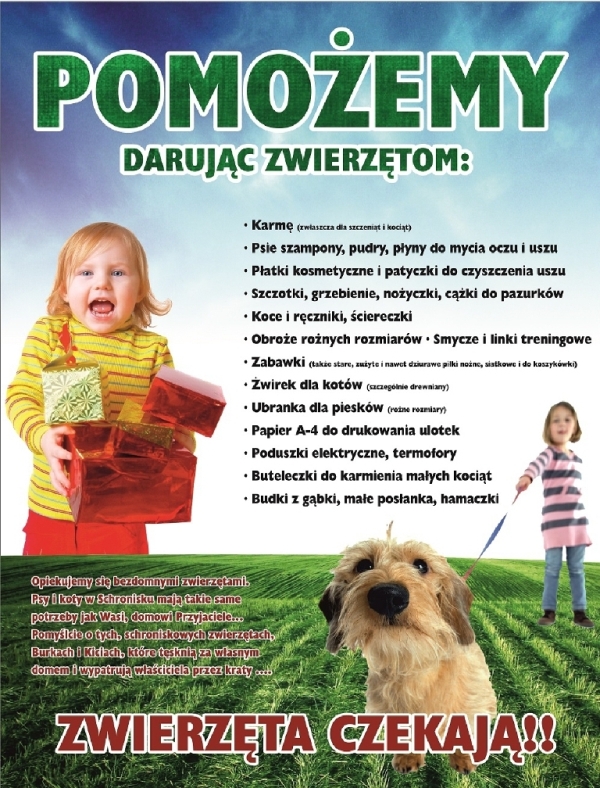 Zimą, są to przede wszystkim: karma dla kotów i psów, koce, makaron, ryż, kasza ale także inne rzeczy, które szczegółowo zostały wymienione na plakacie informującym o akcji.