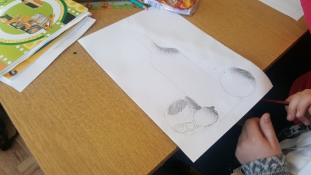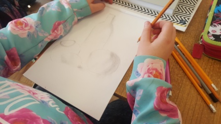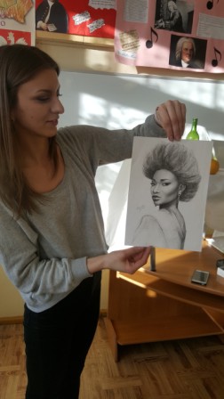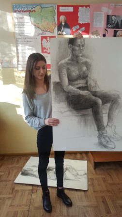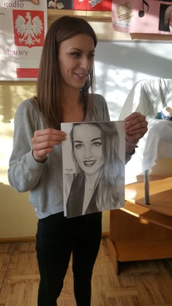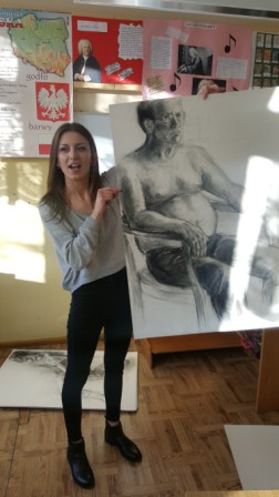 Przy współudziale tak znakomitego gościa odbyły się zajęcia warsztatowe z rysunku. Tematem była martwa natura. Na zakończenie Pani Klaudia zaprezentowała własną twórczość. Trzeba przyznać, że i nasi uczniowie radzili sobie w rysowaniu bardzo dobrze czego dowodem były ładne prace wykonane na tych zajęciach.