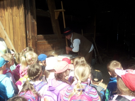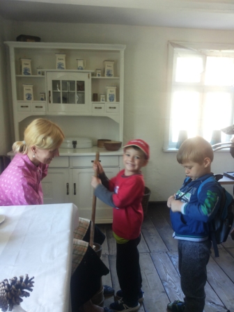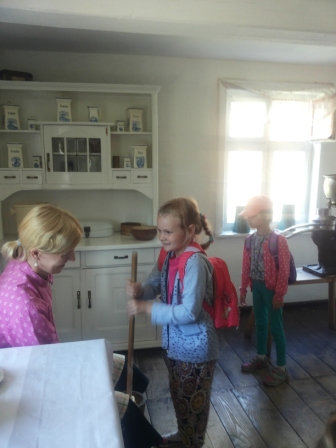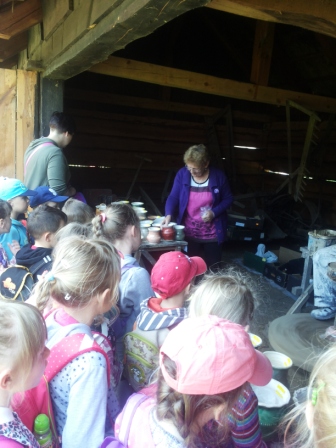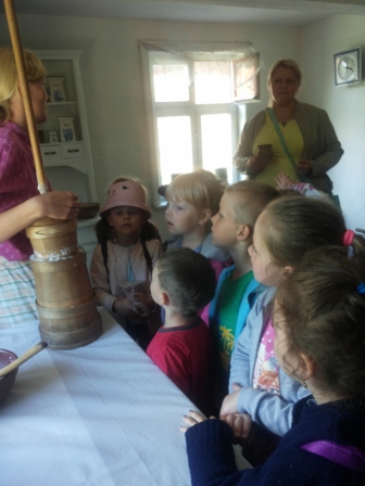 Dzieci miały okazję dowiedzieć się jak dawniej przygotowywano słodycze (oraz je skosztować), brały także czynny udział w produkcji masła (ubijały śmietanę w kierzynkach).