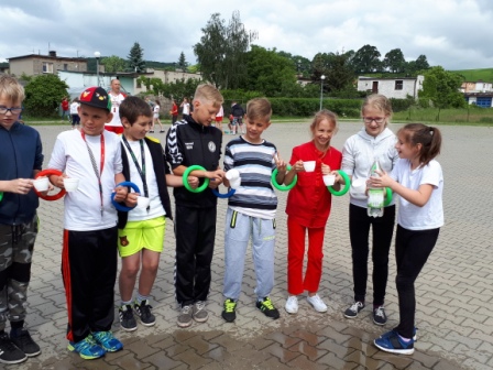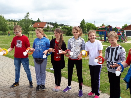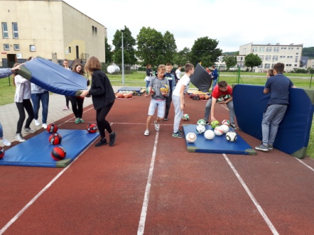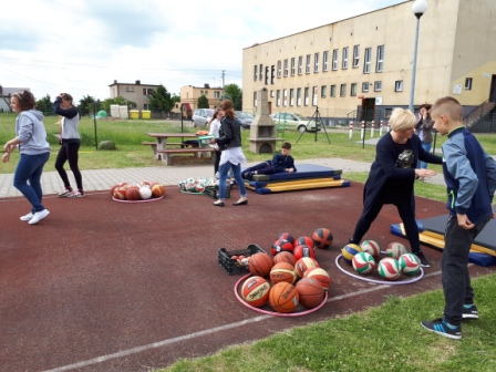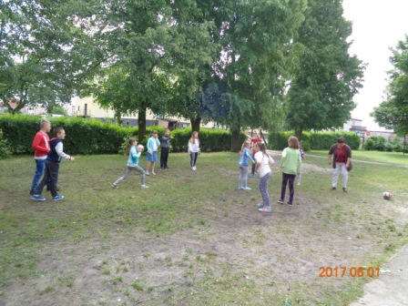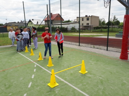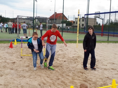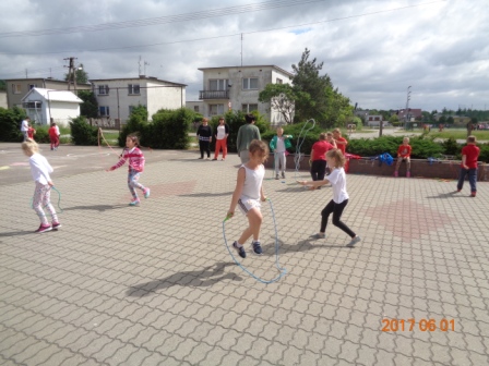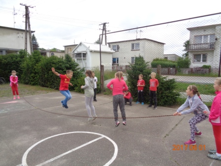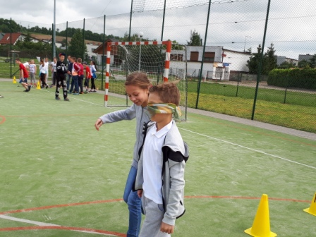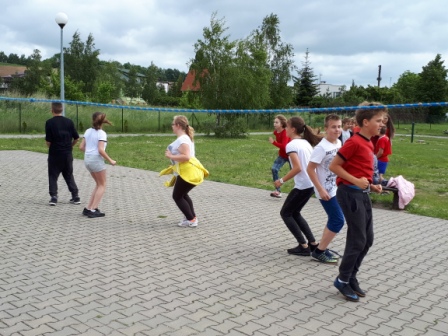 Równolegle, w tym samym czasie uczniowie z klas IV – VI na boisku wielofunkcyjnym uczestniczyli w zabawach i grach o charakterze sportowo – rekreacyjnym. Każda klasa na wyznaczonym stanowisku podejmowała inny rodzaj zmagań. A były to następujące zabawy: Wiódł ślepy kulawego, Żywy kosz, Kanapka, Piętką do bramki, Skakanka, Sturęki, Narty, Wyścig braci syjamskich. Poszczególne klasy musiały zmierzyć się z zadaniami na wszystkich stanowiskach. Różnorodność zabaw i form ruchu była ogromna, tak, aby każdy znalazł w tych zmaganiach coś dla siebie.