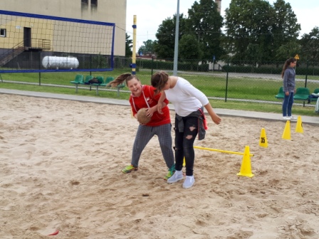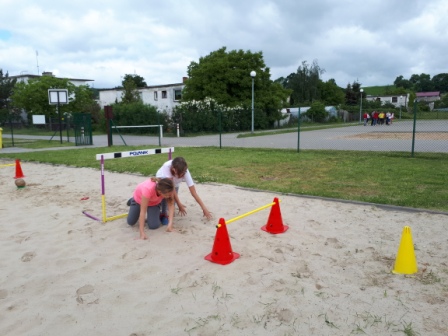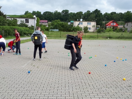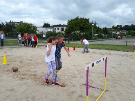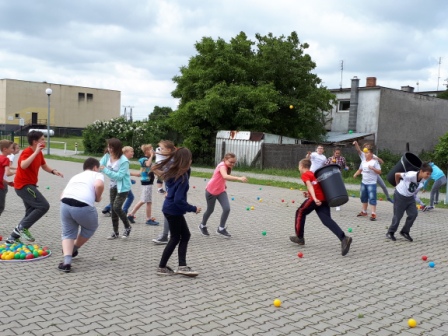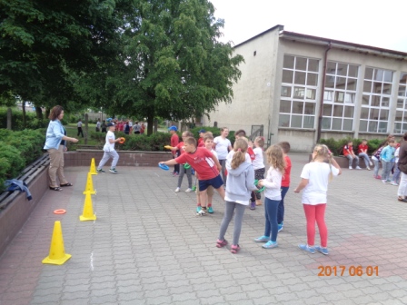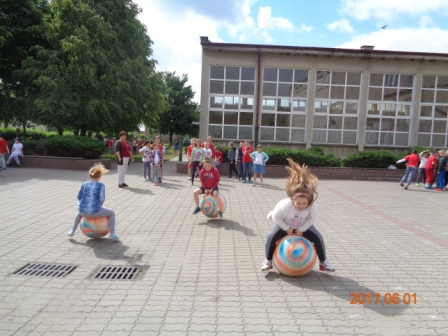 Następnie uczniowie z klas I-III pod opieką swoich wychowawczyń udali się na boisko szkolne, aby uczestniczyć w grach i zabawach na wesoło. Dzieci poprzez ruch i zabawę podjęły zmagania skacząc w workach i na gumowych piłkach, pokonując i omijając przeszkody, trafiając do celu i rywalizując w grze „Dwa ognie”. Najmłodsi uczniowie naszej szkoły bawili się doskonale, dając upust swoim emocjom i niespożytej energii.