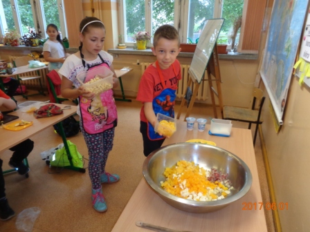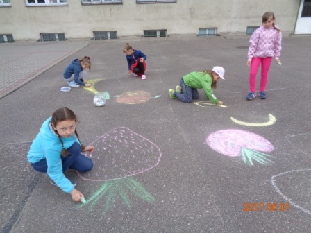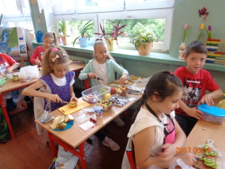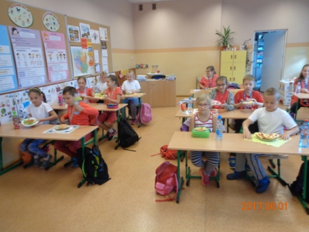 Młodsi uczniowie z klas I-III w ramach zajęć profilaktycznych przygotowywały potrawy owoców i warzyw, pożywne i zdrowe kanapki, wykonały też kredą kolorowe rysunki owoców i warzyw na boisku szkolnym. Dzieci oglądały również prezentację multimedialną oraz film nt. zdrowia i racjonalnego odżywiania się.