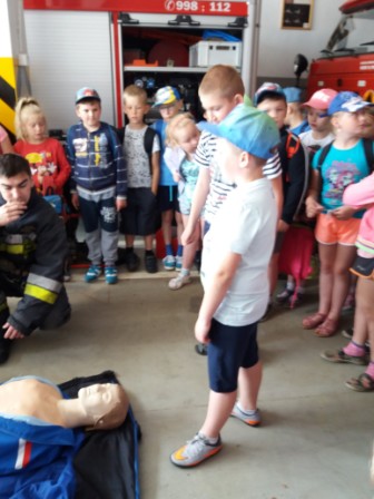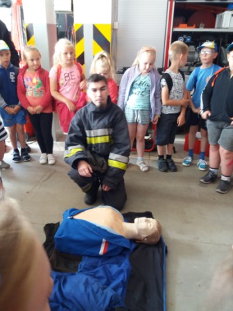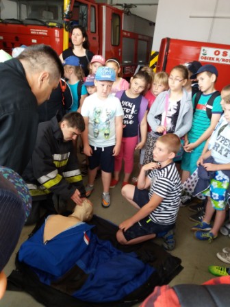 Przypomnieliśmy sobie również numery telefonów alarmowych. Uczniowie mogli również pooglądać wozy strażackie znajdujące się w posiadaniu osieckich strażaków oraz zobaczyć ich wyposażenie i sprzęt pożarniczy. Strażacy chętnie pokazywali swoje stroje oraz sprzęt, który często pomaga w ratowaniu ludzkiego życia. Uczniowie zobaczyli także, jak wygląda udzielanie pierwszej pomocy przy użyciu fantoma. Dzieci były bardzo zadowolone z wizyty w Remizie.