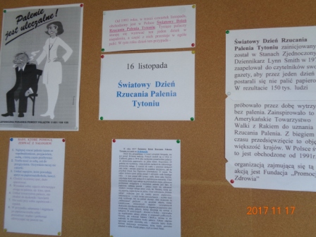 Tego dnia przypadł w tym roku Światowy Dzień Rzucania Palenia Tytoniu, który propagowaliśmy poprzez gazetkę i wystawkę ulotek do rozdawnictwa wśród dorosłych palaczy, chętnych do próbowania rozstania się z nałogiem. Dzień ten jest w naszej szkole początkiem działań edukacji antytytoniowej w postaci programu dla kl. I „Nie pal przy mnie proszę” oraz w kl. IV ”Znajdź właściwe rozwiązanie”.