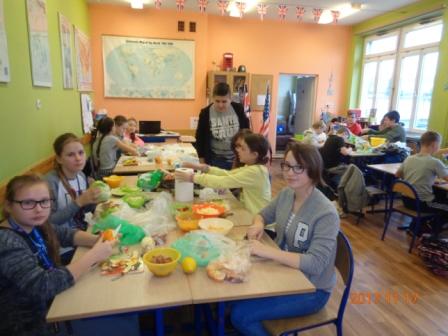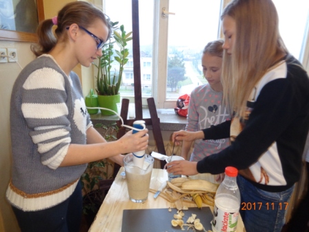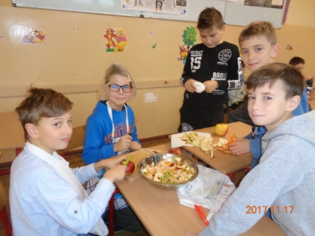 Tradycyjnie jesienną porą przypominamy sobie wskazówki nt. zdrowego odżywiania, dlatego też 17.11.uczniowie kl. IV-VII i klas gimnazjalnych mieli zajęcia praktyczne w zakresie przygotowywania i degustacji zdrowych potraw, kanapek, koktajli i soków. Sale i korytarze przez długi czas, jeszcze po zakończeniu zajęć, przepełnione były aromatem świeżych owoców i warzyw.