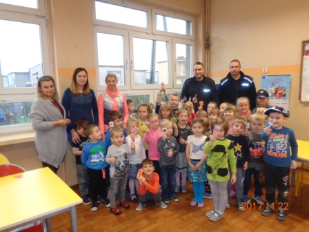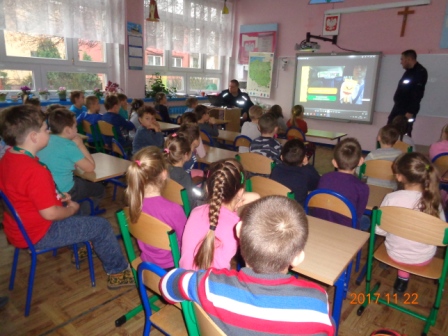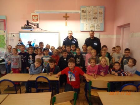 22 listopada oddziały przedszkolne oraz klasy pierwsze naszej szkoły uczestniczyły w pogadankach nt. bezpieczeństwa ruchu drogowego. Przeprowadzili je policjanci z Komisariatu Policji w Wyrzysku – dzielnicowy Mateusz Tomczyński oraz Adam Ozimina. Dzieci, poprzez pytania, miały również okazję poznać bliżej zawód policjanta. Na koniec wszystkie dzieci otrzymały od policjantów słodki upominek i ustawiły się do pamiątkowego zdjęcia.