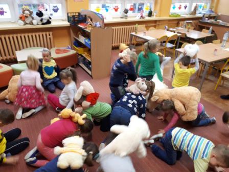 Spotkanie rozpoczęło się od zapoznania przedszkolaków z historią pluszowego misia. Każde z dzieci miało także okazję przedstawić swojego pluszaka na forum klasy. Następnie dzieci i ich misie wzięły udział w porannej gimnastyce do piosenki „Pluszowy miś”.