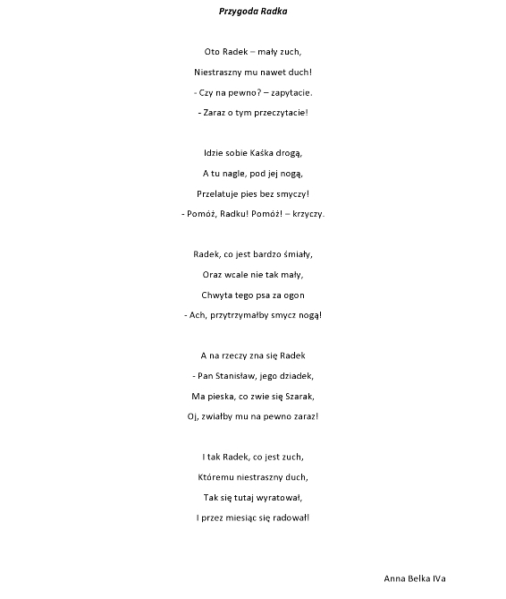 Zacznijmy od ogłoszenia grudniowych laureatów! W kategorii klas I-IV wygrała Anna Belka i jej zabawny wiersz pt. „Przygoda Radka”. Aniu, twórz dalej, czekamy z niecierpliwością!
