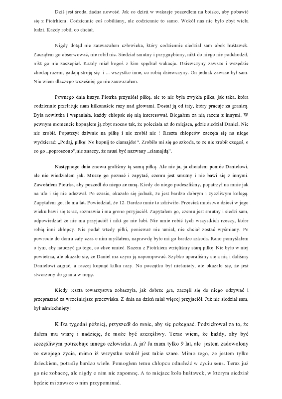 W kategorii klas gimnazjalnych wygrało opowiadanie o magicznej sile przyjaźni i o tym, jak ważna w codziennym życiu jest empatia i zrozumienie tego, że nie każdy musi być idealny, taki sam, jak inni. Napisał je Patryk Rozonka. Gratulujemy i liczymy na to, że nie poprzestaniesz na jednym opowiadaniu i w przyszłym miesiącu będziemy mogli przeczytać inne, równie ciekawe.