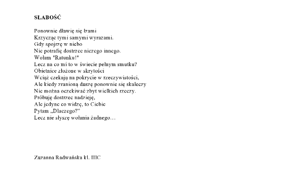 W styczniu natomiast wierszem uraczyła nas uczennica III klasy gimnazjum i ona w tej kategorii zwyciężyła. Zuzanna Radwańska! To jej gratulujemy i czekamy, być może na kolejne liryczne zwierzenia.