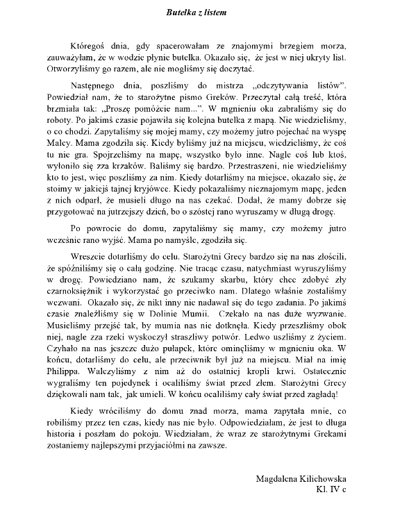 W klasach młodszych zadebiutowała opowiadaniem „Butelka z listem” uczennica klasy IV c Magdalena Kilichowska, która jednocześnie wygrała styczniową edycję w kategorii klas IV- VII. Madziu, świetny początek! Być może uda się Tobie dopisać kolejne części tej fascynującej opowieści? Chętnie przeczytamy!