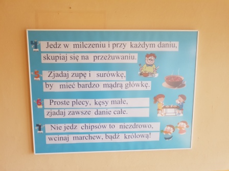 Po zagadkach nadszedł czas na przedstawienie zasad zachowania się w szkolnej stołówce. Uczniowie z Samorządu Uczniowskiego przeczytali swoim koleżankom i kolegom dziesięć reguł Savoir-vivre, które obowiązują w naszej stołówce.