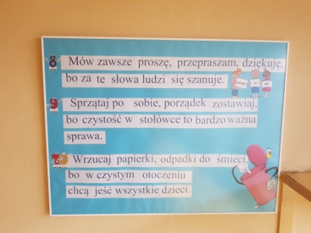Po złożeniu przyrzeczenia, uczniowie z Samorządu Uczniowskiego wraz z opiekunami udali się do szkolnej stołówki, gdzie na ścianie umieścili, wcześniej przyjęte przez całą społeczność szkolną, reguły Savoir-vivre szkolnej stołówki.
