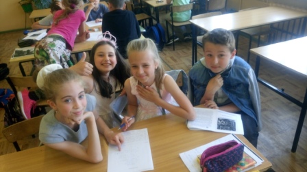 Nie mogło też zabraknąć szczegółowych pytań dotyczących treści lektur. Uczniowie wybierali numer pytania i po kolei na nie odpowiadali. Każdy miał szansę wykazania się i podzielenia swoją wiedzą. Dodatkowe punkty otrzymywała grupa, w której dzieci przebrały się za wybraną postać związaną z naszym konkursem.