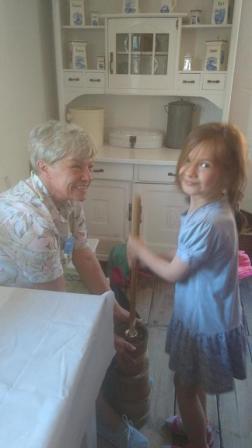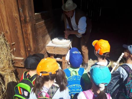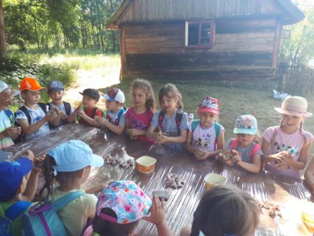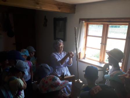 Pobyt w skansenie rozpoczęliśmy od kupna pamiątek. Następnie zwiedziliśmy najciekawsze chaty oraz zapoznaliśmy się z codziennymi zajęciami wykonywanymi na dawnej wsi, m.in. praca garncarza, wyplatanie koszyków oraz sieci, tkanie na krosnach i deseczkach tkackich, praca gospodyni. Jedną z większych atrakcji było samodzielne wyrabianie masła. Każde dziecko brało czynny udział w tej mozolnej pracy. Dzieci uczestniczyły również w wytwarzaniu miseczek z gliny, które po własnoręcznym ozdobieniu mogły zabrać do domu. Na zakończenie przedszkolaki zjadły pyszne lody i bawiły się na świeżym powietrzu.